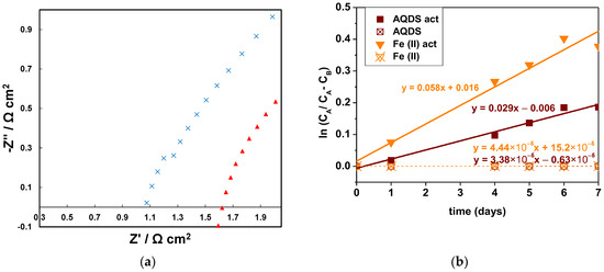 To gain a better understanding of the electrochemical kinetics and mass transport processes of both the redox-active materials, studies using a rotating disk electrode (RDE) were carried out. The diffusion coefficient was determined by the Levich equation (see Equation (S1)) and the values determined were 3.99 × 10−6 and 4.38 × 10−6 cm2/s for the AQDS and Na4[Fe(CN)6], respectively. Using the Koutecky–Levich plot and the Tafel plot, the kinetic constant for both the redox-active materials were obtained by extrapolating to infinite rates; so, 9.96 × 10−3 and 7.99 × 10−3 cm/s were found for the AQDS and Na4[Fe(CN)6], respectively (see Figures S2 and S3 and Equations (S2)–(S4)) [29]. Both results were in a good agreement with the reported results [45]. Lower values than those could compromise the battery performance.