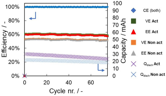 The comparison between the cell resistance obtained by EIS before cycling allowed us to compare the conductivity of the non-pretreated and pretreated membranes (see Figure 6a). The pretreated membrane (blue crosses) showed a lower intercept with the Z′ axis in the high-frequency part of the EIS. During the boiling process, the membranes extended their polymeric structure, resulting in a different internal conformation, which made the pores larger, and this may have led to more accessible ion-exchange groups, improving the conductivity values (up to 53% higher in the case of the pretreated one compared to the non-pretreated one). However, this also led to increased cross-mixing of the active species due to the enhanced permeability. The RAM’s permeability is a key parameter since it limits the capacity of the battery and may also alter other parameters such as viscosity, stability and others. So, an examination of the permeabilities of redox-active materials were carried out in a H-cell for each membrane, the results being 1.7 × 10−3 and 1.3 × 10−6 cm2/s for the [Fe(CN)6]4− and 8.5 × 10−4 and 9.9 × 10−7 for the AQDS in the pretreated and non-pretreated membranes, respectively, (Figure 6b, filled markers and non-filled markers, respectively). Both results were corroborated in the RFB set-up (Figure 7 as a summary of the reported data in Figure S12 and Table S2) despite both membranes showing similar coulombic efficiencies, where the higher resistance of the non-pretreated membrane led to lower voltage and energy efficiencies. The voltage and energy efficiencies using the pretreated membrane (Figure 7, green squares and red triangles, respectively) were around 10% higher than the VE and EE achieved with the non-pretreated membrane (Figure 7, orange squares and grey triangles, respectively). Furthermore, comparing the capacity evolution over the cycles (purple and blue crosses for the non-/pretreated membranes, respectively), a lower capacity decay per hour (−0.33 vs. −0.47 %Qtheo/h) due to the lower permeability was observed for the non-pretreated membrane, as compared to the battery set with the pretreated membrane. As we can see, each component played a different role in the battery’s performance. The use of different amounts of redox-active materials can change the results achieved.