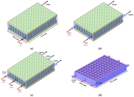 This study analyzed the cooling performance of the battery using ANSYS Fluent 2021 R2 [32]. Figure 1 shows a battery module model and fluid volume for analysis according to the change in the number of ports of the working fluid in the battery module. In this study, the cooling performance was studied by changing the number of inlet and outlet ports of the battery module to 1, 2, and 3. The battery model used for the analysis was a cylindrical 21700 battery, which has a capacity of 4.95 Ah and was designed with a total number of 96. The battery module in Figure 1 was designed to have a battery size of 21 mm (D) × 70 mm (H), a battery holder size of 181.6 mm (L) × 276.4 mm (W) × 14.5 mm (H), and a battery cooling block size of 183.6 mm (L) × 273.4 mm (W) × 72 mm (H). The gap between the batteries is maintained at 1.2 mm. For the analysis under the same flow conditions, the flow rate flowing into each port was designed as in Figure 1a, and the flow rate entering from Figure 1b,c to each port was designed as /2 and /3 of the flow rate flowing into in Figure 1a, respectively, to perform the analysis. Figure 1d shows the volume of fluid flowing through the battery cooling block in the model with three ports. In addition, Table 1 shows the thermal properties of each component of the battery module applied in this study.