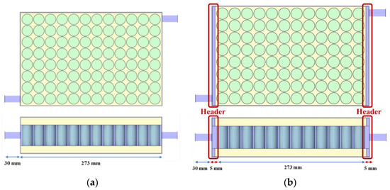 Modeling of the battery module according to the changing header width: (a) Header width = 0 mm; (b) Header width = 5 mm.