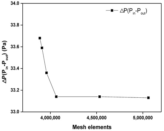 The analysis for evaluating grid independence was conducted by applying refrigerant R134a fluid at initial battery temperature, outdoor air temperature, and coolant inlet temperature at 25 °C when the number of the port was 1 and the flow rate was 1 lpm. Figure 3 shows the change in pressure drop in the battery module according to the number of meshes. When the initial number of meshes was 3,885,580, the pressure drop decreased rapidly from 33.68 Pa, and even if the number of meshes increased further from 4,063,590 to 33.14 Pa, the pressure drop did not increase and converge as a result. Therefore, this study analyzed the battery temperature and cooling performance of the battery cooling block using 4,063,590 meshes.