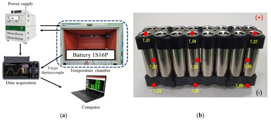 Verification experimental setup: (a) Schematic diagram of experimental setup; (b) 1S16P battery module.