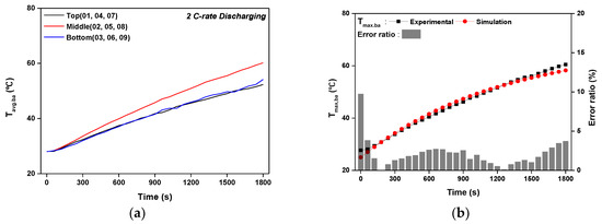 Battery temperature variation under 2 C-rate discharge condition: (a) Average temperature according to time; (b) Comparison of MXT according to time between experimental and simulation results.
