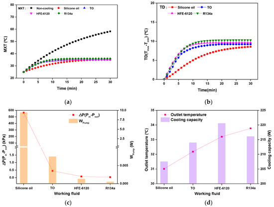 Variation of cooling performance according to working fluids: (a) MXT of battery according to time; (b) TD of battery according to time; (c) Pressure drop and pump power for different working fluids; (d) Outlet temperature and cooling capacity for different working fluids.