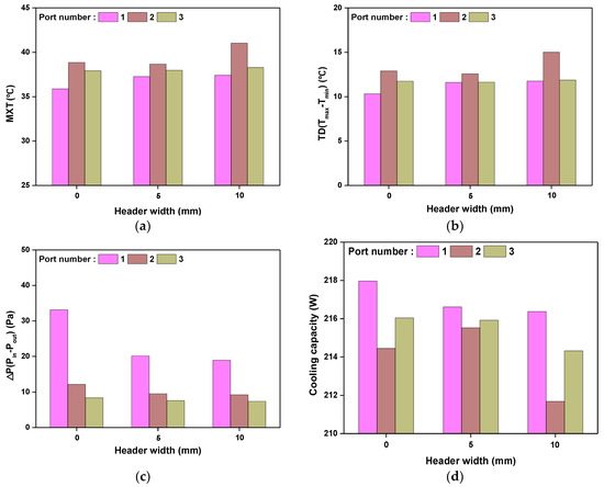 Comparison of cooling performance according to header width: (a) MXT of battery for different header width; (b) TD of battery for different header width; (c) Pressure drop for different header width; (d) Cooling capacity for different header width.