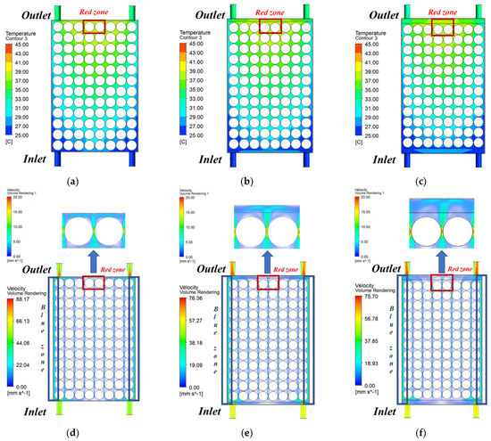 Temperature and velocity distribution according to header width at the battery cooling block with port 2: (a) Temperature contour at 0 mm; (b) Temperature contour at 5 mm; (c) Temperature contour at 10 mm; (d) Velocity contour at 0 mm; (e) Velocity contour at 5 mm; (f) Velocity contour at 10 mm.