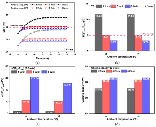 Comparison of cooling performance according to flow rate under 25 °C and 35 °C outdoor air conditions: (a) MXT of the battery according to time; (b) TD of the battery according to time; (c) Pressure drop for different ambient temperatures; (d) Cooling capacity for different ambient temperatures.