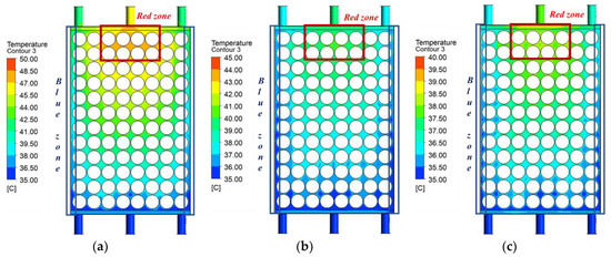 Temperature variation of battery module according to the flow rate under 35 °C outdoor air condition: (a) 1 lpm; (b) 3 lpm; (c) 5 lpm.