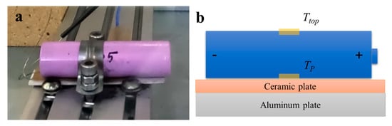 The experimental methods can be classified into two types: battery thermal shock for pre-battery charging, and TR simulation. The battery open-circuit voltage (OCV) is important information when estimating the SOC of the battery, and SOC of the battery can be estimated using the OCV-SOC curve []. Therefore, the OCV-SOC curve was derived using battery testing system (BTS4000-5V6A, Nweare, Shenzhen, China). The OCV was charged to approximately 4.05 (±0.01) V under all experimental conditions. When the voltage range of the battery was 2.7 to 4.2 V, the OCV was 4.05 V, a voltage corresponding to approximately 93.3% of the SOC. In order to accurately measure the OCV to estimate the SOC, a rest time of at least 30 min is required. After charging, the charge was stabilized for approximately 30 min or more; subsequently, the TR experiment was conducted. As shown in Figure 1, for the thermal shock experiment on the battery, an alumina–ceramic-based plate heater (dimensions: 15 mm × 70 mm × 6 mm), a temperature controller (TC200P, Misung Scientific, Yangju, SKorea), and K-type thermocouple were rapidly heated to  of 250–550 °C for battery heating.