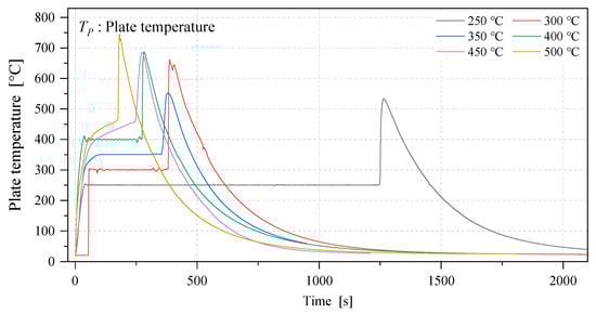 A TR experiment was conducted using a ceramic plate heater under a wide range of temperatures of  from 250 °C to 500 °C, to derive a correlation between  and TR times (, , , and ). Figure 2 and Table 1 present the TR characteristics of lithium-ion batteries with variations in the plate temperature. The time  was required to attain the experimental temperature starting from room temperature. For example,  of 250 °C is 37 s. The amount of heat transfer transmitted to the battery was not considered during the corresponding time. The time difference, , from the target temperature () to the electrolyte vent () refers to the time taken to vaporize the electrolyte and emit combustible gas, which results from the increase in internal pressure owing to the heat transferred to the battery after the temperature of the heat source is increased. This parameter refers to the time taken for vent gas substances to be discharged into the external environment from the electricity storage system or the battery mounted on the electric vehicle. As  increased from 250 °C to 500 °C,  decreased rapidly from a maximum value of 780 s to 1 s. The experimental results reveal that when the lithium-ion battery is exposed to a high temperature, the chances of attaining a specific temperature or emitting harmful gases such as electrolytes in a short time are high.
