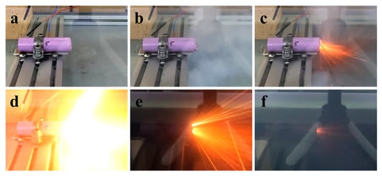 Sequential processes of thermal runaway for a NCA lithium-ion battery at  = 250 °C; (a) 1st vent, (b) electrolyte vent, (c) spark plasma, (d) maximum temperature, (e) lull state, and (f) end of TR.