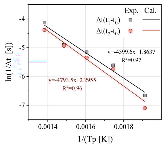 Figure 5 presents the linear relationship between  and . For the two aforementioned reactions that were considered, the first reaction refers to the vent  of the gaseous electrolyte and the overall reaction  that rises rapidly from the beginning. Particularly, the linearity of  and  demonstrate a high level of correlation ( is approximately 0.97). In addition, the linearity of  and  exhibits a high correlation of  = 0.96. Based on the linear relationship between the results  of the two reactions for , the activation energy of the two reactions,  and , are estimated to be 36.6 and 39.9 kJ/mol, respectively.