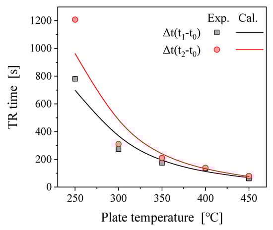 The experimental results of the time difference of the battery TR and plate target temperature can be expressed using the correlation Equation (4). Under the thermal abuse temperature (),  indicates the time difference from the time (), at which the target plate temperature is attained, to the time  of the electrolyte vent;  implies that the temperature rapidly rises from the time () when the gaseous electrolyte begins to vent, and the heating rate exceeds 1 °C/s. The correlation between  and  with respect to  is plotted in Figure 5; the experimental results related to  are expressed using Equation (4).