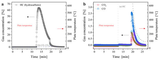 The analyzed results of the battery TR gas composition in relation to the thermal shock temperature of  are presented in this section. A typical TR precursor of a lithium-ion battery is a phenomenon in which not only self-heating occurs, but also an electrolyte in an internal liquid phase is vaporized and ejected from the battery. The analysis results of the real-time concentration measurements of HC, namely CO2 and CO, over time inside a sealed reactor are illustrated in Figure 7. The electrolyte comprising vaporized HC is ejected outside the battery before the emergence of TR in the temperature range 250–300 °C. Subsequently, CO2 and CO are simultaneously detected during self-heating and TR. This process results in the rapid release of thermal energy and decomposition of the HC-based electrolyte, and the maximum CO2 and CO concentrations were measured to be 2.47% and 4.78%, respectively. Reportedly, the higher the energy density, the lower the ratio of CO2 to CO will be [,]. In this experiment, as the same battery and SOC were utilized, the concentration ratio of the combustion gases CO2 and CO was approximately 0.5 regardless of the temperature condition. Considering the gas composition for the TR experiment from 350 to 500 °C, a rapid increase in temperature was observed when the HC was detected. As a considerable amount of thermal energy was instantly released, the lower temperature of the battery gradually increased from 250 °C to 500 °C, and the maximum temperature attained was found to be 747 °C. As indicated by the results of this experiment, when the lithium-ion battery is exposed to a high temperature, leading to TR, a larger amount of heat energy than that supplied is instantaneously emitted, and the high-temperature atmosphere acts as an igniter, causing a continuous combustion–explosion reaction between the battery vented gas and the ambient air.