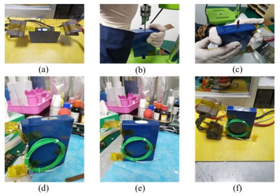 Process on thermocouple implantation. (a) Discharge; (b) drill the hole; (c) open access; (d) inserting the thermocouple; (e) gluing the thermocouple; (f) charge.