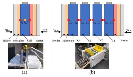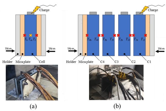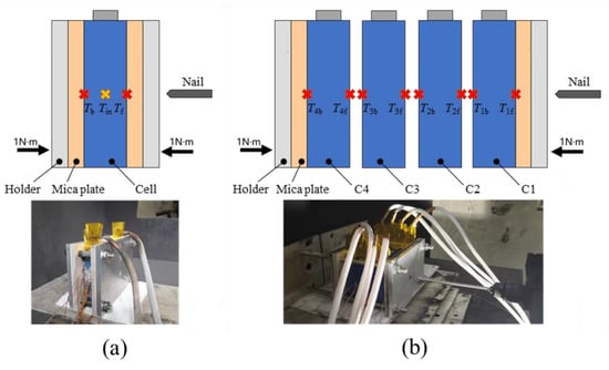 The nail-penetration abuse tests for the cell and the module were performed according to the test regulations []. The schematic diagram of the nail-penetration abuse test for the cell is shown in Figure 3a. The cell was charged to 100% SOC, and it was fixed by the holder, which contained two stainless-steel clamping plates and screws. To ensure the stability of the cell during testing, each screw was torqued to 1 N·m. In order to reduce the heat dissipation between the cell and the holder, two mica plates with a thickness of 10 mm were placed between the cell and the holder, and their dimensions were the same as the front surface of the cell. The holder and the mica plates were designed with a 10-mm-diameter through-hole corresponding to the center of the cell so that the nail could completely penetrate the cell. Two thermocouples (Tf, Tb) were located at the center of the front and back surfaces of the cell, and one thermocouple (Tin) was implanted inside the cell to measure the internal temperature. Voltage wires were clamped to the positive and negative lugs of the cell to collect voltage data. In the test, a stainless-steel felting nail with a diameter of 6 mm was used to penetrate the cell at a speed of 25 mm/s. The nail was kept inside the cell after the cell TR.