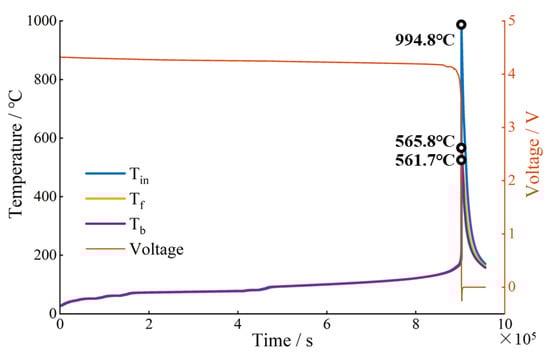 Using the EV-ARC test, the characteristic temperature of the TR cell was determined, including the self-generated heat temperature (T1), the TR trigger temperature (T2), and the TR maximum temperature (T3). The real-time voltage and temperature values of the different thermocouples are shown in Figure 6. The temperature of each thermocouple remained consistent until TR occurred, and it rose exponentially when TR happened. The maximum temperature of Tf and Ts was 565.8 °C and 561.7 °C during the test, and the maximum internal temperature Tin was 994.8 °C, which was nearly 430 °C higher than the surface temperature. The initial voltage of the cell was 4.3 V, and the voltage dropped rapidly to 0 after TR occurred, which indicated that a serious internal short circuit occurred in the cell. After the cell TR, the temperature of each thermocouple dropped rapidly and approached uniformity.