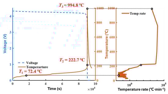 When the temperature reached about 200 °C, the cell voltage dropped sharply with the internal temperature of the cell rose rapidly. Several seconds later, the temperature rate reached 1 °C·s−1. At this moment, the temperature was T2 [].