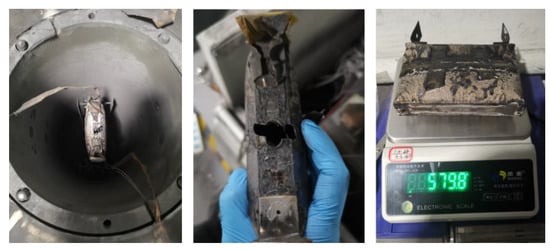 Figure 7 shows some photos of the cell wreckage after the EV-ARC test. The cell shell swelled significantly, and the surface of the cell was covered with black debris, and it could be seen that the safety valve of the cell had been opened, from where the jelly roll was ejected, resulting in the loss of mass. By calculation, the mass loss (Mloss) was 272.3 g.