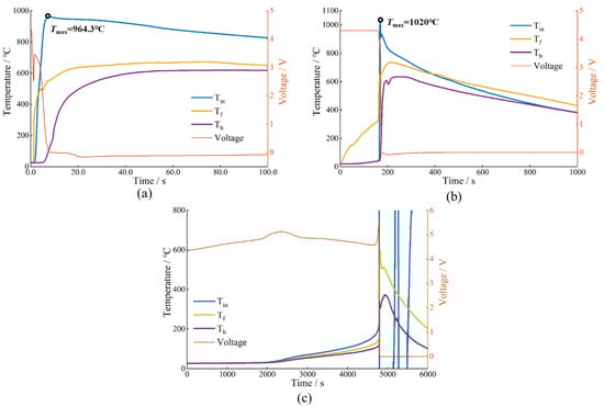 Figure 9a shows the temperature and voltage curves of the cell in the nail-penetration abuse test. At the moment of 0 s, the nail pierced into the cell, and subsequently, TR occurred. The voltage of the cell dropped from 4.31 V to 2.53 V within 0.2 s. Then, it rebounded to 3.41 V and gradually dropped to 0 during the following 6.5 s. The voltage fluctuation during TR was caused by the internal short circuit caused by the nail. After 0.3 s, when the voltage began to drop, Tf first increased, and after about 1 s, Tin rose rapidly, followed by Tb after about 3.8 s. At the moment of 7.6 s, Tin reached the highest value of 964.3 °C, and at this time, Tf and Tb were about 550 °C and 95 °C, respectively, and they were still in the rising stage.