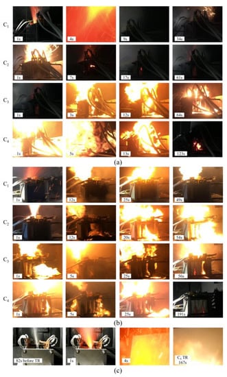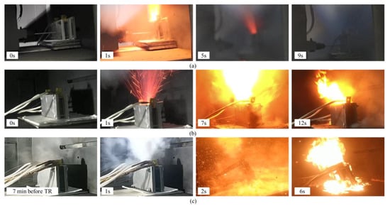 Figure 10c displays several images of the TR process in the test. In the previous 5 min of cell TR, the safety valve had broken, and white smoke was constantly coming out of the cell. With cell TR, a massive white smoke was ejected from the cell, and after 1 s, it was ignited, and violent flames and sparks engulfed the test area. Due to the excessive internal pressure of the cell, both the cell and the holder could be seen to be overturned by the shock wave of TR. After that, the flame of the cell became smaller, and the burning process lasted for 163 s.