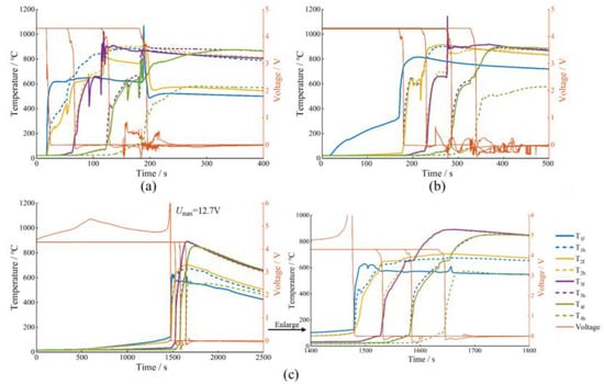 Figure 9c illustrates the curves of the temperature and voltage of the cell under the overcharge abuse test. In the test, the cell was charged from 100% SOC at a rate of 1/3 C. The voltage steadily increased to exceed its nominal cut-off voltage (4.35 V) until 2000 s. Due to the large capacity of the cell, there was no significant exothermic reaction inside the cell during this period, and the temperature of the cell barely increased. When the cell was overcharged to about 120% SOC (i.e., about 2100 s), the cell voltage rose faster and reached 5.13 V at about 2400 s. The temperature of the cell also started to increase slowly due to the heat generated by the internal side reactions of the cell. After this, there was an internal short circuit inside the cell, which caused the voltage to decrease slowly, and at the same time, the cell temperature rose even faster, with the internal temperature rising to 170 °C at the moment of 4700 s. As the overcharge continued, the internal resistance of the cell increased under the influence of the internal short circuit and led to a sharp increase in voltage. The cell temperature continued to rise, resulting in the deformation and melting of the separator, which eventually led to cell TR. It is notable that due to the instantaneous release of energy stored inside the cell, the TR process was too aggressive and caused the failure of the internal implantation thermocouple.