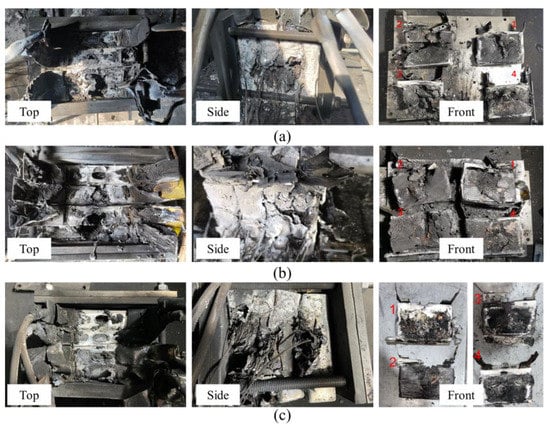 Figure 14a illustrates images of the cell wreckage after the test. The cell’s shell melted in many places and formed multiple metal adhesions after cooling, with the most obvious adhesions at the bottom between the cells. The breakage was more severe on the top of C1 and C2; in addition, the side surface from C2 to C4 was broken and ejected a large amount of jelly roll. Compared with the cell TR test, each cell in the module was more severely damaged.