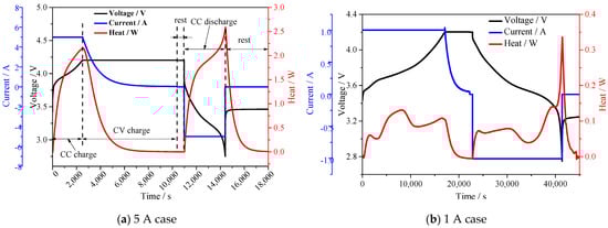 The heat generation rate, available capacity, operating current, working voltage, and ambient temperature were recorded by an isothermal battery calorimeter (IBC, THT Inc., Bletchley, UK) and a charge/discharge cycler, respectively. Figure 1 shows two cases with a 1 A and 5 A operating current under 25 °C ambient temperature, while the heat generation rate is not monotonous during both discharge and charge stage of the 1 A case. The maximum value of the heat generation rate during the charge stage occurs at the end of the constant current (CC) charge of the 5 A case, while the maximum heat generation rate occurs during the middle stage of CC charge, in the 1 A case. The maximum heat generation rate during the discharge stage occurs at the end of discharge, which is found in both 1 A and 5 A cases. The result means that the internal mechanism of heat generation is different under high current and low current. In all tests, a voltage drop is found at the beginning of discharge, and a voltage regen is found at the end of discharge. Both voltage drop and voltage regen are related to the internal resistance; voltage drop is also called over-potential.