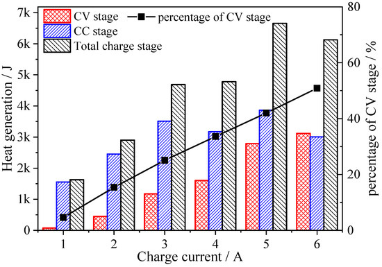 Figure 3 shows heat generations during the charge stage of CC, CV, and the total charge stage changing as the charge currents increase; the contribution of heat generation during the CV stage is shown. Heat generation is calculated by using the heat generation rate integral over time. Heat generation during the CV charge stage is linear, increasing from 0.075 kJ to 3.12 kJ as the charge current increases. The total heat generation during the charge stage increases as the current increases from 1 A to 5 A, while heat generation in the 6 A case is lower than heat generation in the 5 A case. The charge time for 6 A is less than that of the 5 A case, which dilutes the effect of current on the heat generation rate. Figure 4 also shows that the contribution of heat generation during the CV charge stage increases as the charge current increases. The contribution of heat generation during the CV stage is more than 50% during the 6 A case.