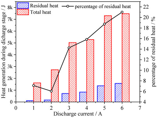 Both total heat generation and residual heat generation increase as discharge current, and the contribution of residual heat generation is just 5~6% under the 1 A and 2 A cases, while the value increases to 20% during the 6 A case. This means that as current increases, the heat absorbed by the battery itself is also increasing, which would take more than 1/5 of the total heat generation. The absorbed heat would make a large temperature gradient during battery operation, which causes inhomogeneity and safety problems.