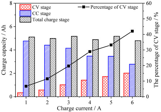 Figure 5 shows the relationship between the charge capacity and charge current during CC, CV, and the total charge stage, respectively. The charge capacities for the six cases are 4.77, 4.41, 4.15, 3.47, 3.46, and 2.78 Ah during the CC charge stage, and 0.34, 0.57, 1.02, 1.41, 1.71. and 2.02 Ah during the CV charge stage, which means that charge capacity during the CC charge stage decreases as current increases, while the charge capacity during the CV charge stage has an opposite tendency. Total charge capacities are 5.11, 4.98, 5.17, 4.88, 5.17, and 4.80 Ah during the total charge stage, which operates independently of the charge currents, as all the cases have the same cutoff current of 40 mA. During the 6 A case, the contribution of charge capacity during the CV stage takes more than 40%, which means the CV stage plays an important role in charge capacity during large current charge cases.