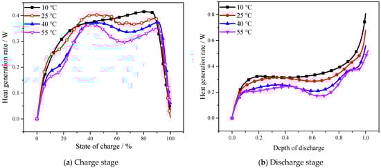 Figure 7a shows the heat generation rates of four temperatures under operating current of 2 A, as a function of SOC during the charge stage. The heat generation rate of the 10 °C case is different from the other three cases, and the heat generation rate curve has only one peak at 10 °C, while other curves have more than two peaks and two valleys. The maximum heat generation rates during the charge stage are 0.415 W, 0.403 W, 0.375 W, and 0.367 W, for 10 °C, 25 °C, 40 °C, and 55 °C cases, respectively. Figure 7b shows the heat generation rates as a function of DOD during the discharge stage. The heat generation rate curve is not monotonously increasing as the DOD increases; this phenomenon is more significant under 25 °C, 40 °C, and 55 °C cases, in which the valley between DOD from 0.5 to 0.8 is obvious. As the temperature increases, the valley is more significant. In 10 °C cases, the valley is negligible. The maximum heat generation rates during the discharge stage are 0.811 W, 0.0.681 W, 0.564 W, and 0.525 W, for 10 °C, 25 °C, 40 °C, and 55 °C cases, respectively. This phenomenon shows that the mechanism of heat generation at the 10 °C case is different from 25 °C, 40 °C, and 55 °C cases.