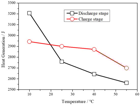 Figure 10 shows the relationship between charge capacities and ambient temperature during the discharge stage. The total discharge capacity increases as temperature increases, while heat generation decreases. Residual heat takes about 7~12% of the total heat under 2 A cases, with the temperature under 10 °C to 55 °C. The results show the effect of temperature on available capacity is important, while the effect of temperature on heat generation is less than the effect of current.