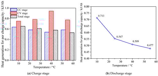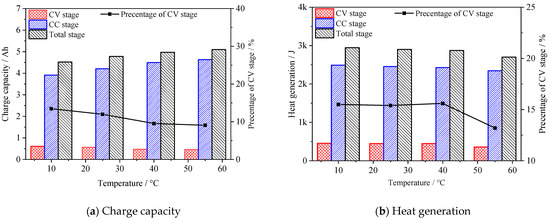 Figure 9a shows the relationship between the charge capacity and ambient temperature during CC, CV, and the total charge stage, respectively. The charge capacity for different ambient temperatures are 3.91, 4.21, 4.50, and 4.64 Ah, during the CC charge stage, and 0.61, 0.57, 0.47, and 0.46 Ah, during the CV charge stage. The results show that the charge capacity during the CC charge stage increases as ambient temperature increases, while the charge capacity during the CV charge stage decreases as ambient temperature increases. The total charge capacities are 4.52, 4.78, 4.97, and 5.10 Ah, for 10, 25, 40, and 55 °C, respectively. This result means that the storage of electric power increases with ambient temperature increasing from 10 °C to 55 °C. As the temperature increases, the contribution of the CC charge capacity increases from 86.5% to 91.0%, which means the CC charge stage becomes more effective during high temperatures. Figure 9b shows the heat generation during the charge stage of CC, CV, and the total charge stage changing as the ambient temperature increases. The heat generations are 2.488, 2.453, 2.425, and 2.342 kJ, during the CC charge stage, and 0.455, 0.447, 0.447, and 0.357 kJ, during the CV charge stage, with the charge current of 2 A for 10 °C, 25 °C, 40 °C, and 55 °C, respectively. As temperature increases, the contribution of heat generation during the CC charge stage increases from 84.5% to 86.8%. The total heat generations during the charge stage are 2.944, 2.900, 2.872, and 2.699 kJ, for 10 °C, 25 °C, 40 °C, and 55 °C. Heat generation during the charge stage decreases as the ambient temperature increases, under the operating current of 2 A.