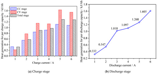 Figure 11 shows heat generation of per available capacity changing as discharge current. The heat generation of per available capacity during the CV stage is larger than that during the CC stage. The heat generation of per available capacity is 0.3 kJ/Ah during the 1 A charge case, which increases to 1.2 kJ/Ah during the 6 A charge case. The result shows that the quick charge is not safe because of a large amount of heat generation, which needs to find a new material in order to decrease the internal resistance to solve the heat generation problem. The heat generation of per available capacity is 0.332 kJ/Ah during the 1 A discharge case, which increases to 1.605 kJ/Ah during the 6 A discharge case. The large current charge and discharge current makes heat generation approximately linear in growth, and increases the internal temperature gradient during battery operation, which may accelerate battery ageing.