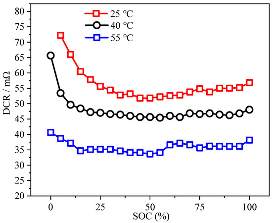 Figure 13 shows the direct current resistance (DCR) measured by HPPC. The IR increases as the SOC decreases during the discharge stage, which creates more heat generation and less available discharge capacity.