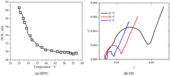 Figure 14a shows that the IR under 100% SOC decreases from 60.6 mΩ under 25 °C to 49.6 mΩ under 55 °C, which causes the available broad voltage range under high temperature, causing less heat generation and more available capacity. Figure 14b shows the IR impedance under three different ambient temperatures. The results show that the IR decreases as temperature increases from 25 °C to 55 °C, as the charge transfer impedance and diffusion impedance are lower under high temperature.
