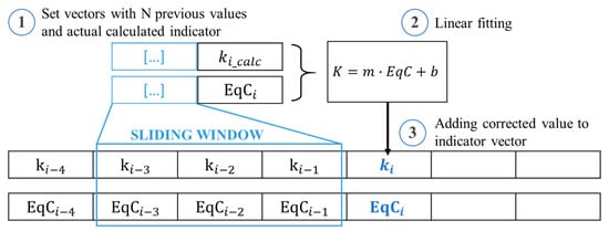 The computed values of those indicators could show deviations that are due to the DRT calculation (solving an optimization problem with regularization methods [43]) but that could also come from noisy measurements, especially thinking about onboard implementation in BMS [17,19]. Therefore, a method to filter the indicators is necessary to better appreciate the evolution of DMs and to understand which one is prevailing. The indicators’ filtering process is based on a linear fitting model applied on a defined number of prior measured points with a sliding window. The process is composed by 3 steps, as shown in Figure 4: