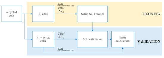 Finally, a validation flow was conceived to evaluate the accuracy of the resulting SoH estimation. Training and validation subsets are shown in Figure 6. Given a specific number of tested cells n (n = 10 in this case), the two subsets are defined as follows: