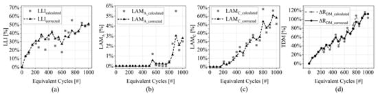 The total degradation indicator is showed in Figure 7d, where the corrected trend (i.e., sum of corrected DMs) shows a more stable evolution compared with the calculated one.