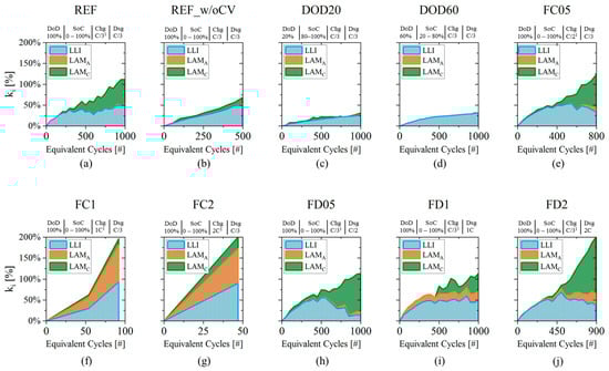 Figure 8 presents an overview of all the degradation indicators of all the tested cells (reference to cell IDs in Table 2). Each DM is represented with a different color and their cumulated area represents the indicator as function of EqC. In general, has a big influence on cell degradation and it is the main DM for reduced DoD protocols (Figure 8c,d), but it is also true that the same cells (ID:DOD20, ID:DOD60) recorded the smallest , with values lower than 30% at EoT (at 1000 EqC). In other, more stressing conditions, also the other DMs appeared. In cell ID:REF, cell ID:FC05 and the high discharging rate cells, has also a large impact on degradation (Figure 8a,e,h–j). In the cases of high discharging rate at 0.5C (cell ID:FD05) and at 2C (cell ID:FD2), growth up to 100% and 140%, being the most impacting DM and suggesting that cathode particle cracking is driving cell degradation. High charging rate conditions at 1C and 2C instead brought large and fast degradation, with an increase of up to 200% in less than 100 EqC (Figure 8f,g). In both cases the degradation is driven by and in similar quantities: the lithium plating generated inside those cells was reducing the available surface, therefore inhibiting graphite use [44,57]. The other two cells that showed “after-knee” behavior, i.e., cell ID:REF_w/oCV and cell ID:FC05 presented a small amount of (5–12%) at late cycles corresponding to the “after-knee” region (Figure 8b,e). In those cases, EoL was reached mainly due to lithium plating without significant inhibition of graphite surface as in high charging rate cells (ID:FC1 and ID:FC2).