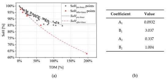 The piecewise model presented in Section 2.2.2 was used to perform SoH estimation on the experimental dataset under investigation. The training subset was chosen to include different variety of testing conditions: high charging rate, high discharging rate and reduced DoD (Table 3). It is paramount to include cells with after-knee SoH behavior in the training group to properly initialize and set the SoH model. The two found SoH functions are showed in Figure 9a both for “pre-knee” and “after-knee” conditions. The values of fitted coefficients are given in the table of Figure 9b.