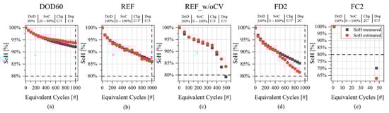 Cell ID:REF shows accurate estimation results in Figure 10b, with MAE = 0.38% and MBE = −0.11%. Reduced DoD protocol with cell ID:DOD60 shows similar values of MAE and MBE, with a tendency in overestimating SoH when EqC > 400, as shown in Figure 10a. Cell ID:REF_w/oCV (Figure 10c) shows a good estimation both in the “pre-knee” and “after-knee” regions, even though the SoH tends to be overestimated in the second region, with MAE = 1.28% at EoL. In the case of fast discharge at 2C (Cell ID:FD2), the SoH underestimation happens in the range between 400 and 900 EqC, as shown in Figure 10d, accounting for a MAE of 1.56%.Lastly, cell ID:FC2 (Figure 10e) with fast charge at 2C shows the largest MBE and MAE, with the same magnitudes (−7.46% and 7.46%). The source of this large error is twofold: on the one side the availability of only one measurement to perform the estimation and (ii) on the other side the deeply aged condition, with measured SoH equal to 70.2%.