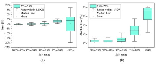 Box plot representation of the (a) error; and (b) the absolute error for the different SoH ranges introduced in Table 5 with 5 cells in the training set.