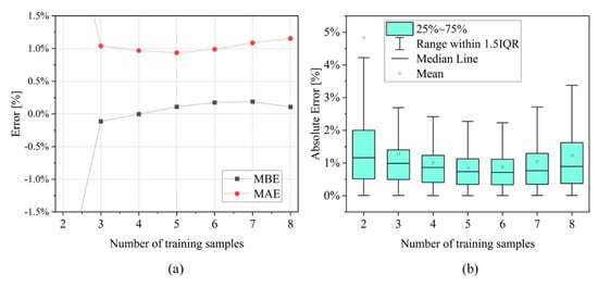 Analysis of all the possible combinations of training sets with a number of cells between 2 and 8: (a) MBE and MAE results over the whole SoH range; and (b) box plot results in the SoH range 90–85%.