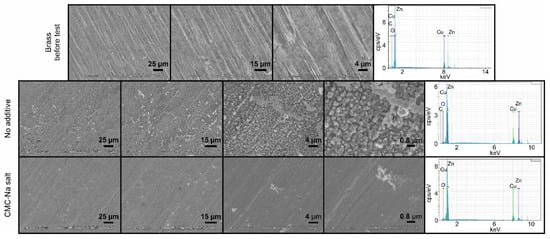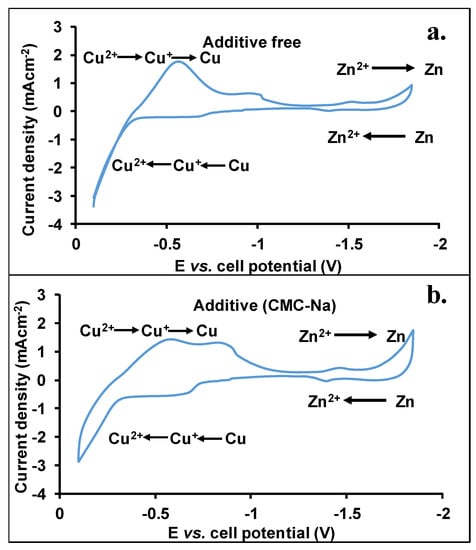 As seen in Figure 1a,b, the voltammograms with the use of brass anodes are complex since within the investigated potential range the reduction-oxidation of copper and related species also takes place. The potential range from −0.3 V up to −1 V corresponds to the reduction of copper (Cu(II) to Cu(0), gross) [33,34]. Due to the formed passive layer on the surface of the brass electrode, both Cu(II) and Cu(I) are present. At higher potential, the Cu(II) is reduced to Cu(I) species, while around −1 V Cu(0) is formed. The broad CV peaks observed are, most likely, due to the overlapping peaks. Interestingly, applying the CMC-Na salt as an additive a positive shift can be found for the reduction of Cu(I) species.
