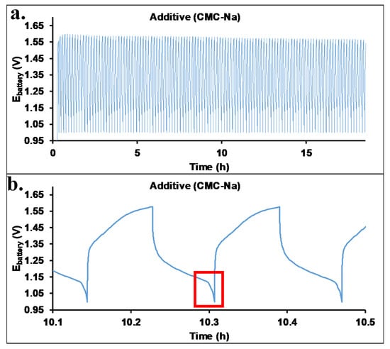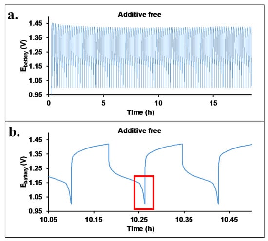 First, the battery filled with additive-free electrolyte was investigated, which showed excellent performance (Figure 2). The working potentials varied from 1.0 V to 1.45 V. The relatively low potential can be explained by the involvement of a two-electron mechanism (the peroxide pathway) taking place on the charcoal-based cathode as detailed in our previous work [28]. Every time, the battery reached 1.0 V limit during the discharging process and stable performance was observed up to more than 100 cycles. In Figure 2a,b, the cyclic performance test and the zoomed cycles are shown in the time interval of 10.05–10.45 h, respectively. Similar shapes were observed for all the cycles. The shape of the curves will be detailed later. It is also clearly seen that the charging potential was reached at 1.33 V; after that, only a very small increase in the potential was observed within the cycle. During the discharge, stable cell potential was obtained until 1.15 V. After that period, a sharp decrease in the cell potential was observed (for instance, in Figure 2b, from 10.25 min shown red frame) indicating the depletion of zinc from the outer layers of the brass anode. Such a decrease was not seen in the case of the metal Zn anode [28]. The small difference between the charging and discharging potentials indicates a low overpotential, which results in high energy efficiency for the battery. The energy efficiency was 80% while the Coulomb efficiency was higher than 92%. The efficiencies versus cycle numbers are presented in Figure 3.