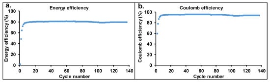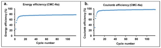 One of the main shortcomings of KOH electrolytes in batteries is the evaporation of water, which brings about a change in the concentration of the KOH and K2[(Zn(OH)4)] during operation. The rate of evaporation may be decreased by the increase in the viscosity of the electrolyte. Therefore, carboxymethyl cellulose-Na salt (CMC-Na) was used as a viscosity improver. Recently, we have shown that CMC-Na salt with 250 kg/mol molecular weight and 1.2 functionality results in a high increase in viscosity (75 mPas vs. 1.5 mPas additive free) [28], with a small increase in the battery working potential range. Figure 4 shows the cycling performance test of the Zn-air battery filled with an electrolyte containing CMC-Na salt. Similar to the additive-free electrolyte, excellent performance was also obtained. The maximum of the working potential range increased up to 1.52 V. High energy efficiency (Eeff: 75%) and Coulomb efficiency (Ceff: 92%) were determined similar to that of the additive-free cell (80%). The small decrease in the energy efficiency values may originate from the increased electric resistance of the electrolyte containing CMC-Na salt. Comparing our results with energy efficiency values (60–75%) found in the literature [36,37,38], it can be surmised that the values obtained for our cells are outstanding. The energy efficiency and Coulomb efficiency as a function of cycle numbers are shown in Figure 5.