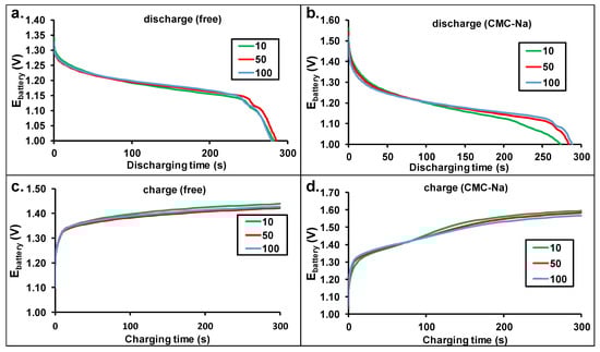As it was shown in Figure 2 and Figure 4, the shapes of the charging-discharging curves are different from those obtained with Zn anode where the potential decay was uniform [28]. The 10th, 50th, and 100th cycles were selected from both experiments (without or with additive) for further evaluation. The charge-discharge curves are presented in Figure 6. The additive-free electrolyte reveals nearly constant charging and discharging potentials in the range of 20 to 250 s. The charging and discharging potentials are close to each other, indicating the high energy efficiency of the battery operation. Sharper change was measured in the cell potentials with the use of CMC-Na salt additive, resulting in lower energy efficiency; however, the potential difference was still low. It is to be noted that the current of the charging and discharging steps were the same in all cases. The stable performance of the batteries is demonstrated in Figure 6 indicating a constant capacity of our battery up to more than 100 cycles. Furthermore, this finding also demonstrates the high reversibility of the deposition-dissolution of the Zn on the surface of the brass anode. At the end of the discharge steps, a fast potential decrease was observed. This latter finding suggests that there is a large difference between concentrations of the Zn electrolyzed onto the surface and in the brass lattice.