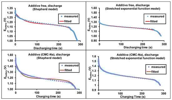 As seen in Figure 7, the Shepherd model closely describes the discharge curves for both the additive-free and CMC-Na-containing batteries. However, the fittings are not totally convincing, especially in the case of battery with CMC-Na salt-containing electrolyte. Calculations with the Shepherd model showed that the potential decrease in the middle part of the discharging step is smaller than those obtained from the experiments. As we have shown previously [28], the application of stretched exponential function adequately described the potential change of discharge, since numerous parallel reactions take place with slightly different activation energies. The lack of excellent fitting may originate from the more complex electrochemical processes. Therefore, we suggest the modification of the exponential factor to a stretched exponential one [28] in the Shepherd model (Equation (1)), by adding a µ factor to it. Thus, the modified Shepherd equation can be read as: